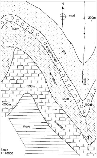 Study the map showing elevation of selected locations and outcrops of sedimentary beds.